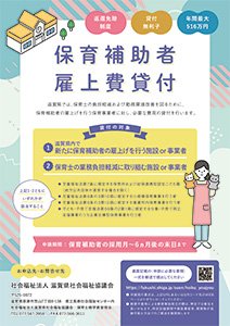 保育士の負担軽減および勤務環境改善を図るため、保育補助者の雇上を行う保育所・認定こども園の事業所に対し保育補助者の雇上費用を貸付ける制度です。